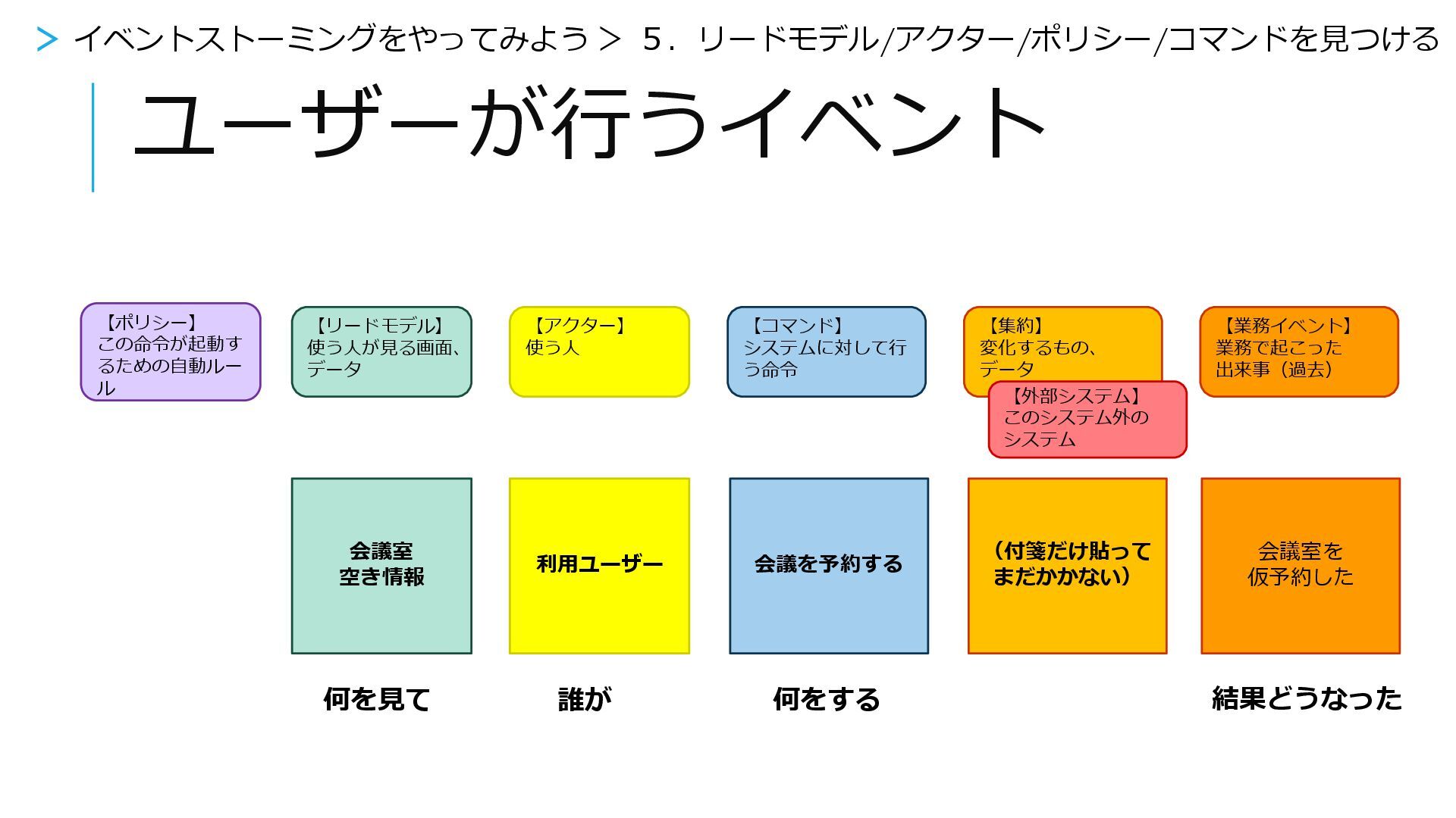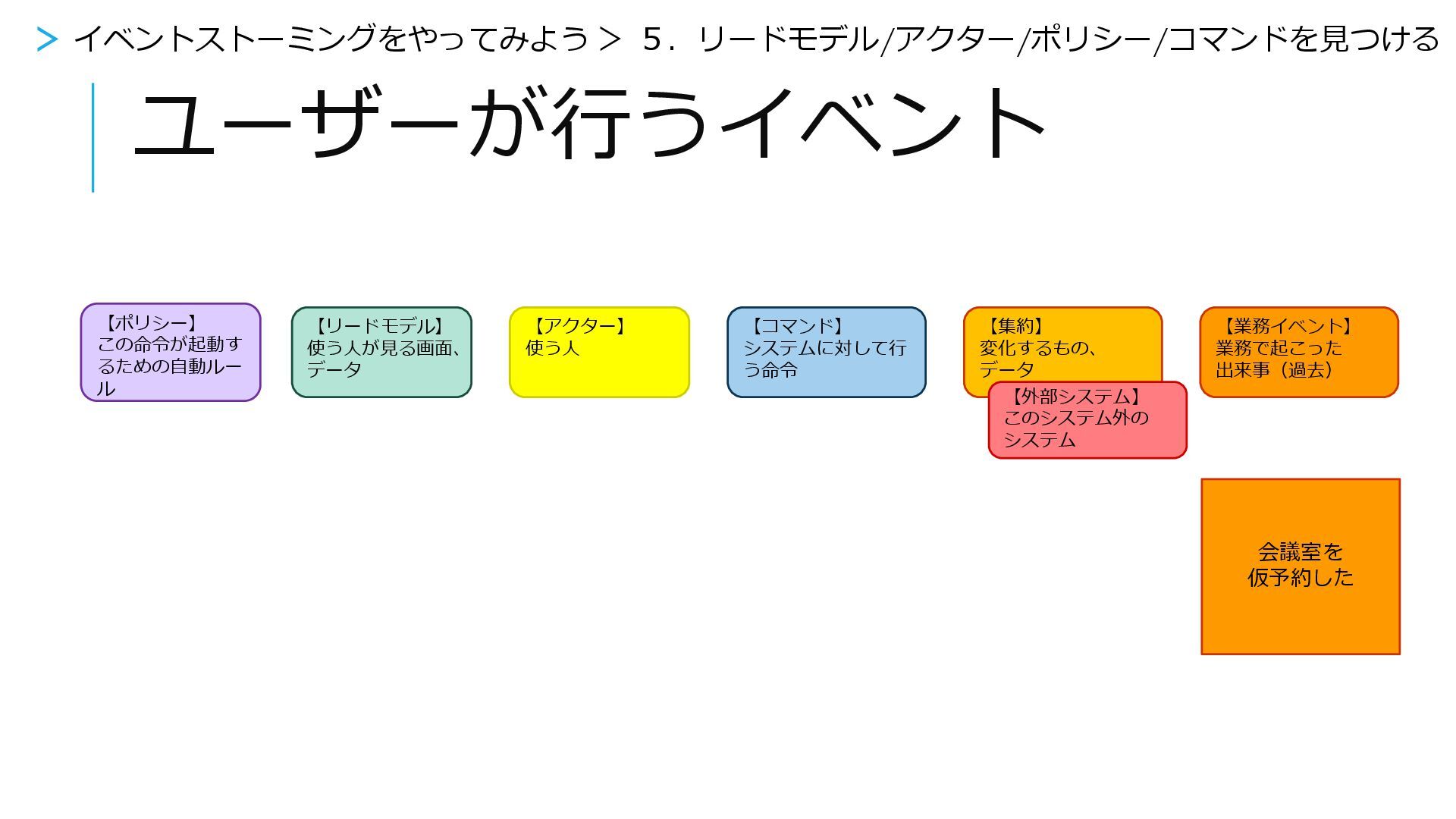 何をする 【業務イベント】 業務で起こった 出来事(過去) 【リードモデル】 使う人が見る画面、 データ 【アクター】 使う人 【コマンド】 システムに対して行 う命令 【集約】 変化するもの、 データ 【外部システム】 このシステム外の システム 【ポリシー】 この命令が起動す るための自動ルー ル 会議室を 仮予約した > イベントストーミングをやってみよう > 5.リードモデル/アクター/ポリシー/コマンドを見つける