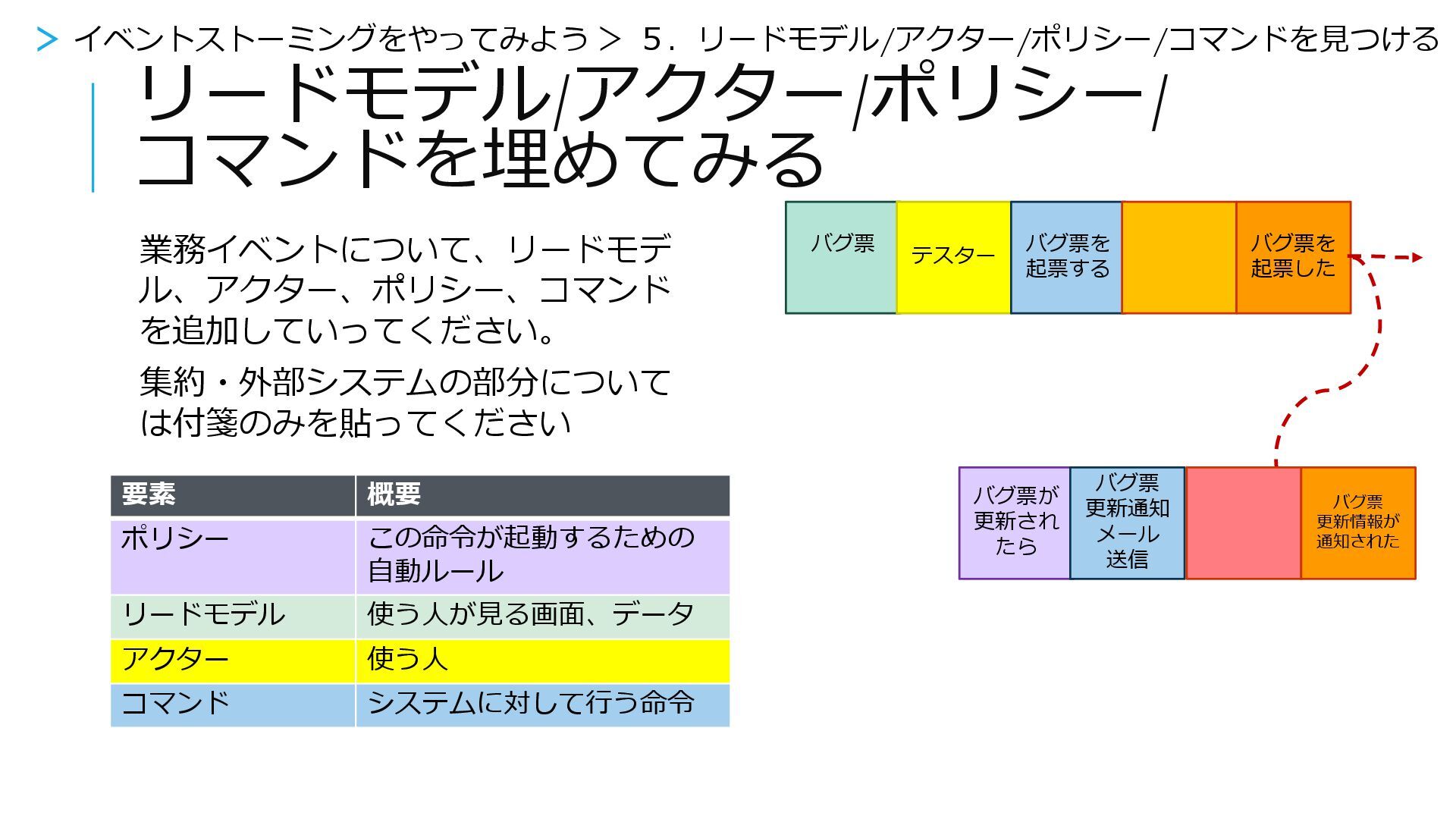 リードモデル/アクター/ポリシー/ コマンドを埋めてみる 業務イベントについて、リードモデ ル、アクター、ポリシー、コマンド を追加していってください。 集約・外部システムの部分について は付箋のみを貼ってください バグ票を 起票した バグ票