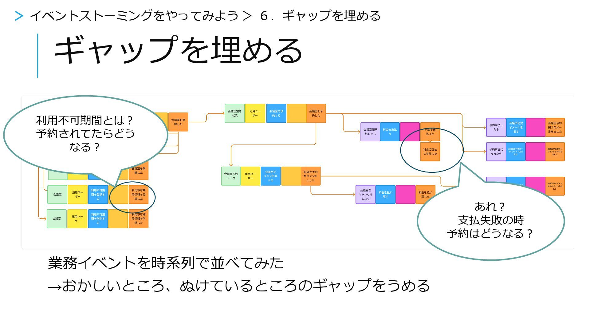 ギャップを埋める 業務イベントを時系列で並べてみた →おかしいところ、ぬけているところのギャップをうめる あれ? 支払失敗の時 予約はどうなる? > イベントストーミングをやってみよう > 6.ギャップを埋める
