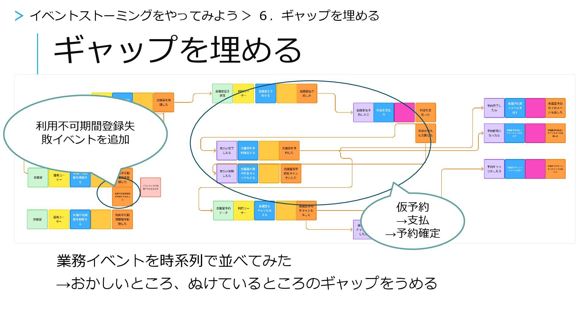 ギャップを埋める 業務イベントを時系列で並べてみた →おかしいところ、ぬけているところのギャップをうめる > イベントストーミングをやってみよう > 6.ギャップを埋める 仮予約 →支払 →予約確定