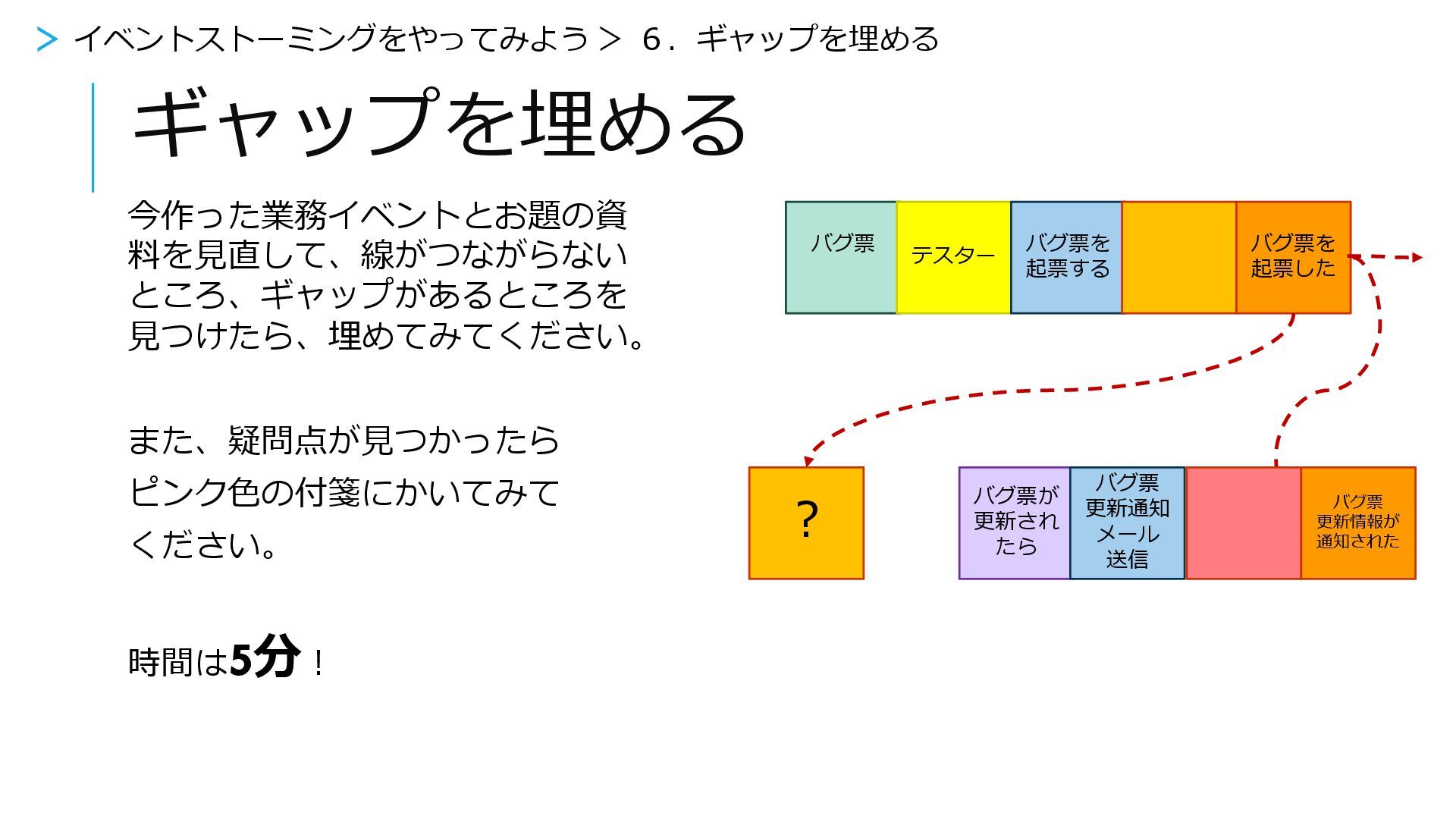 ギャップを埋める 今作った業務イベントとお題の資 料を見直して、線がつながらない ところ、ギャップがあるところを 見つけたら、埋めてみてください。 また、疑問点が見つかったら ピンク色の付箋にかいてみて ください。 時間は5分! >