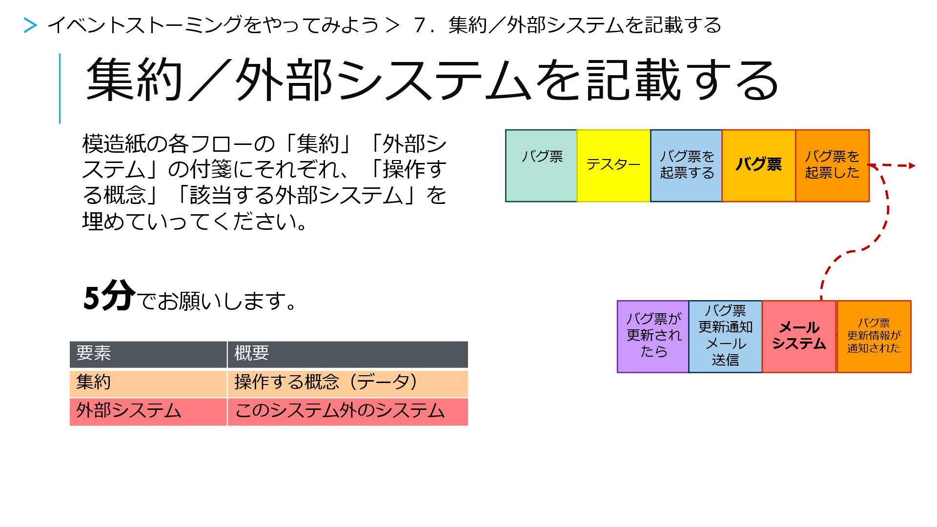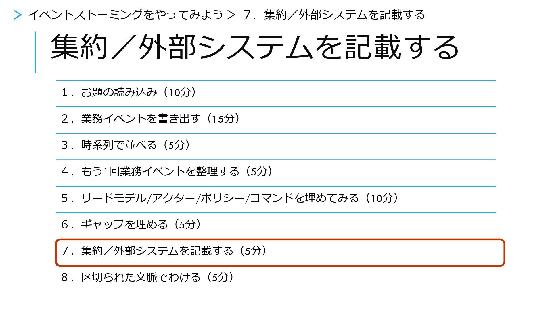 集約/外部システムを記載する 1.お題の読み込み(10分) 2.業務イベントを書き出す(15分) 3.時系列で並べる(5分) 4.もう1回業務イベントを整理する(5分) 5.リードモデル/アクター/ポリシー/コマンドを埋めてみる(10分) 6.ギャップを埋める(5分) 7.集約/外部システムを記載する(5分) 8.区切られた文脈でわける(5分) >