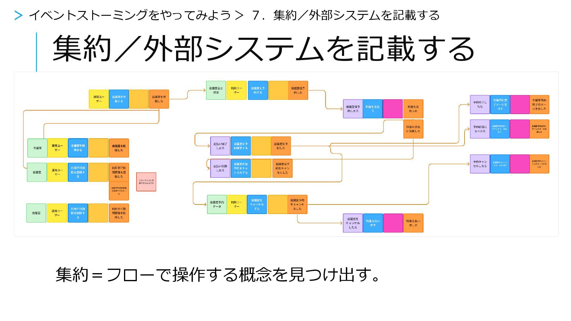 集約/外部システムを記載する > イベントストーミングをやってみよう > 7.集約/外部システムを記載する 集約=フローで操作する概念を見つけ出す。