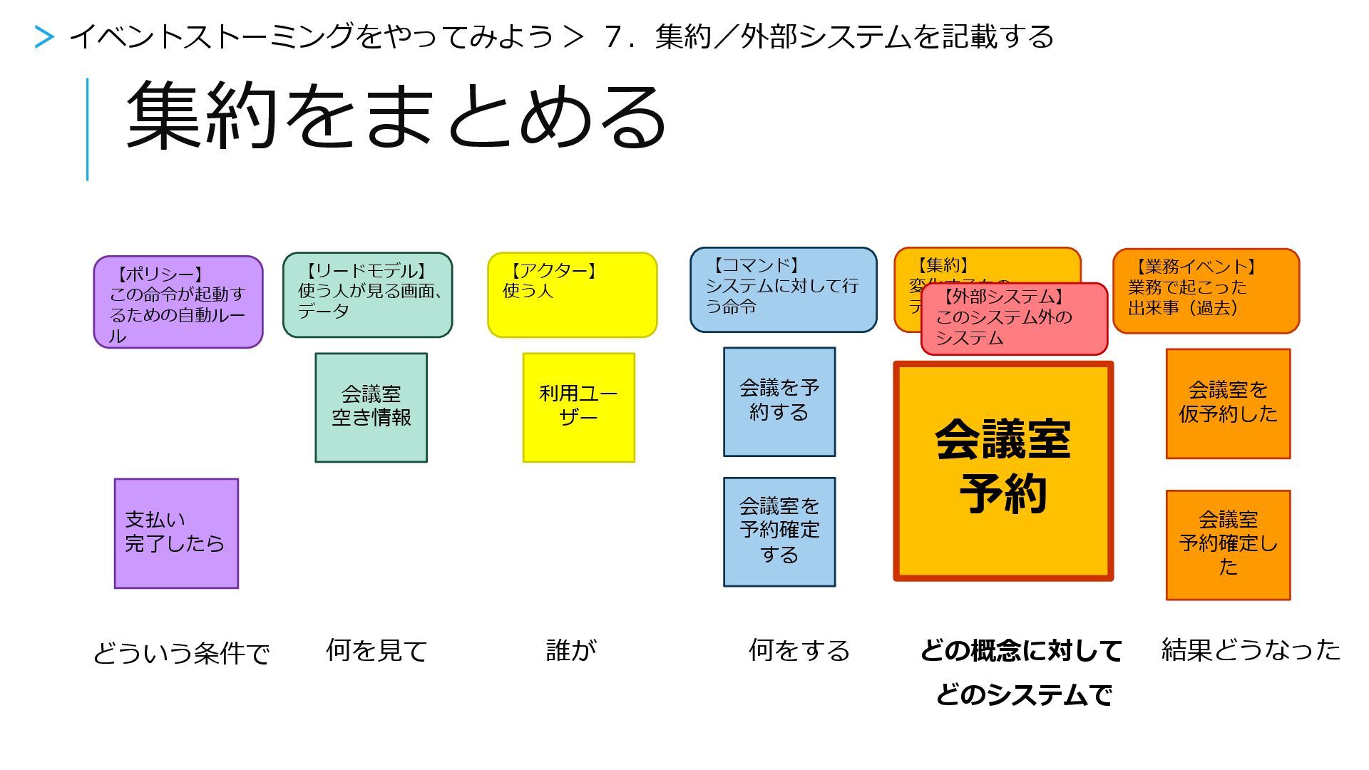 システムに対して行 う命令 【集約】 変化するもの、 データ 【外部システム】 このシステム外の システム 会議室 空き情報 利用ユー ザー 会議を予 約する 会議室を 仮予約した 会議室を 予約確定 する 会議室 予約確定し た 【ポリシー】 この命令が起動す るための自動ルー ル 支払い 完了したら 何を見て 誰が 結果どうなった 何をする どの概念に対して どのシステムで どういう条件で 集約をまとめる > イベントストーミングをやってみよう > 7.集約/外部システムを記載する
