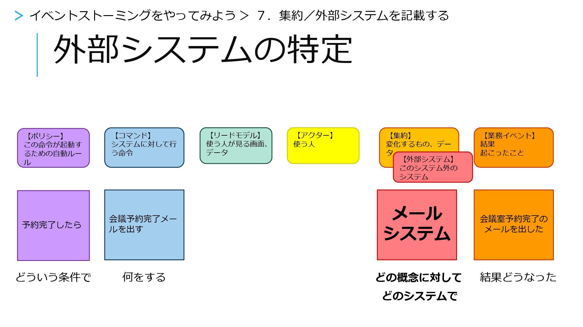 【外部システム】 このシステム外の システム 【ポリシー】 この命令が起動す るための自動ルー ル 会議予約完了メー ルを出す 予約完了したら 会議室予約完了の メールを出した どういう条件で どの概念に対して 結果どうなった 何をする どのシステムで 【リードモデル】 使う人が見る画面、 データ 【アクター】 使う人 メール システム > イベントストーミングをやってみよう > 7.集約/外部システムを記載する