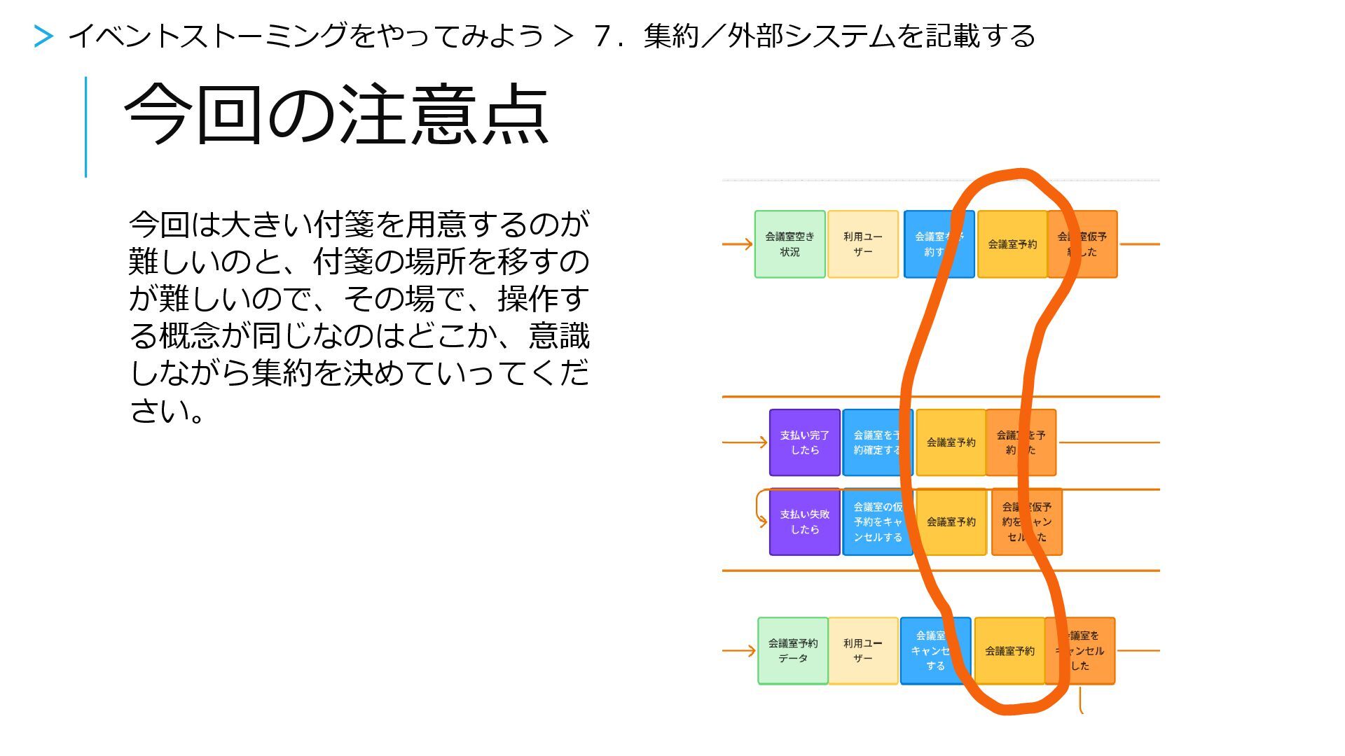 今回の注意点 今回は大きい付箋を用意するのが 難しいのと、付箋の場所を移すの が難しいので、その場で、操作す る概念が同じなのはどこか、意識 しながら集約を決めていってくだ さい。 > イベントストーミングをやってみよう >