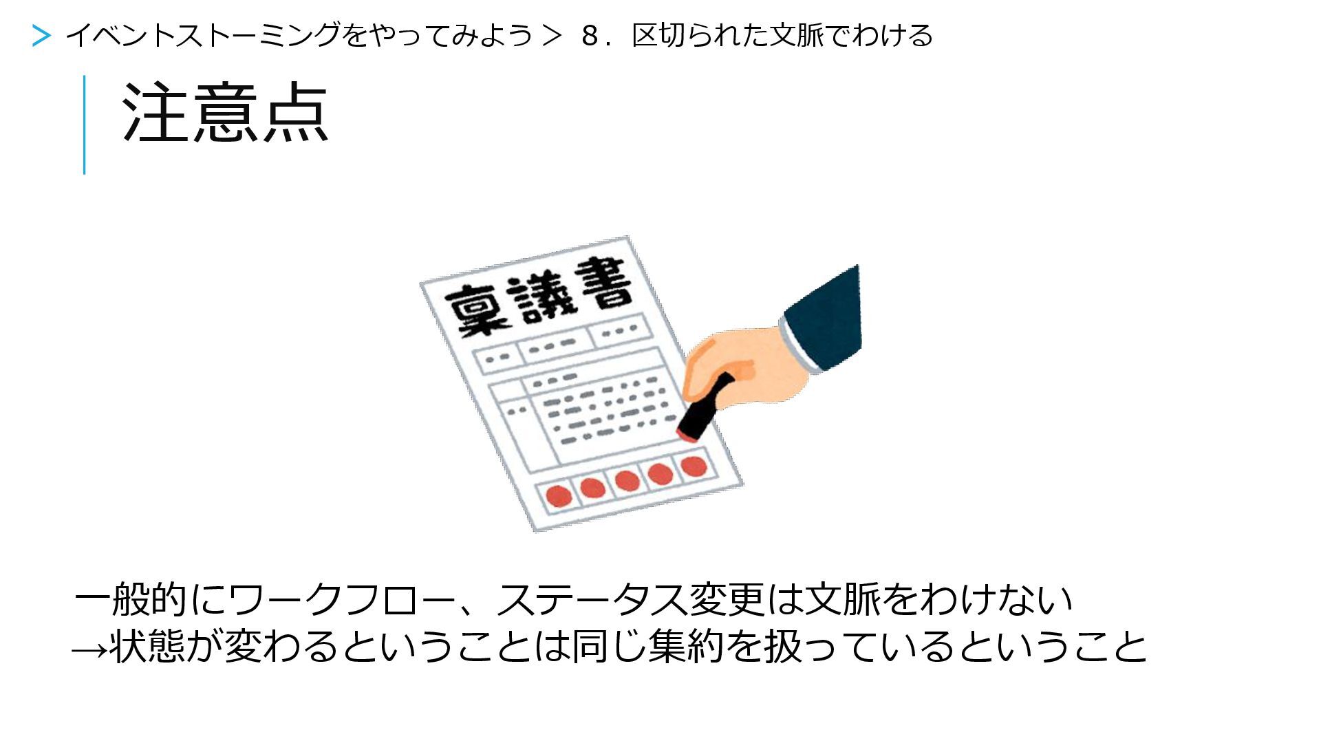 注意点 一般的にワークフロー、ステータス変更は文脈をわけない →状態が変わるということは同じ集約を扱っているということ > イベントストーミングをやってみよう > 8.区切られた文脈でわける
