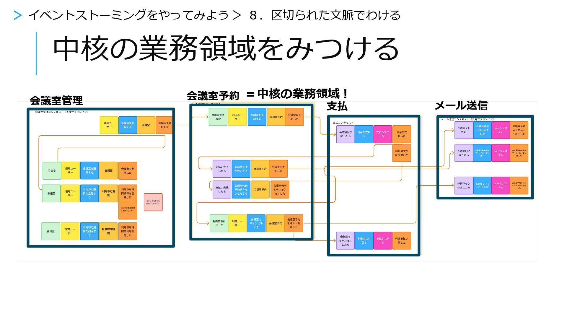 中核の業務領域をみつける =中核の業務領域! > イベントストーミングをやってみよう > 8.区切られた文脈でわける 支払 会議室管理 会議室予約 メール送信