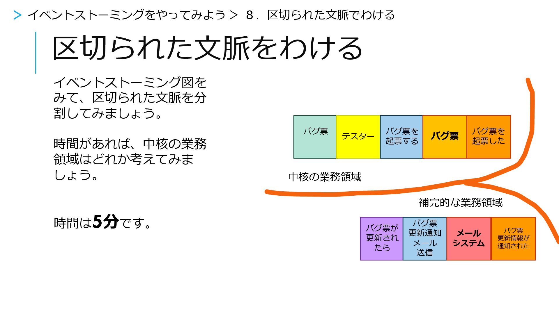 概要 中核の業務領域 競合他社との違いを生 み出す業務活動 システムの中核業務 一般的な業務領域 どの会社でも同じやり 方をする業務領域 補完的な業務領域 そのシステムを支える ための業務活動 > イベントストーミングをやってみよう > 8.区切られた文脈でわける