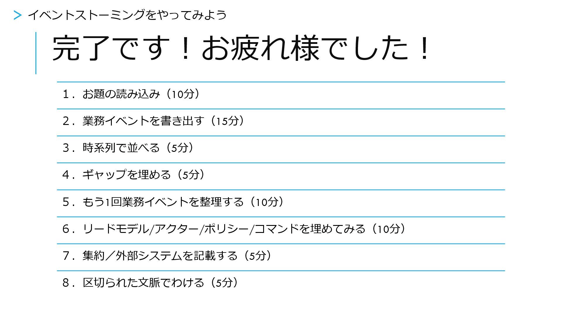 完了です!お疲れ様でした! 1.お題の読み込み(10分) 2.業務イベントを書き出す(15分) 3.時系列で並べる(5分) 4.ギャップを埋める(5分) 5.もう1回業務イベントを整理する(10分) 6.リードモデル/アクター/ポリシー/コマンドを埋めてみる(10分) 7.集約/外部システムを記載する(5分) 8.区切られた文脈でわける(5分) >