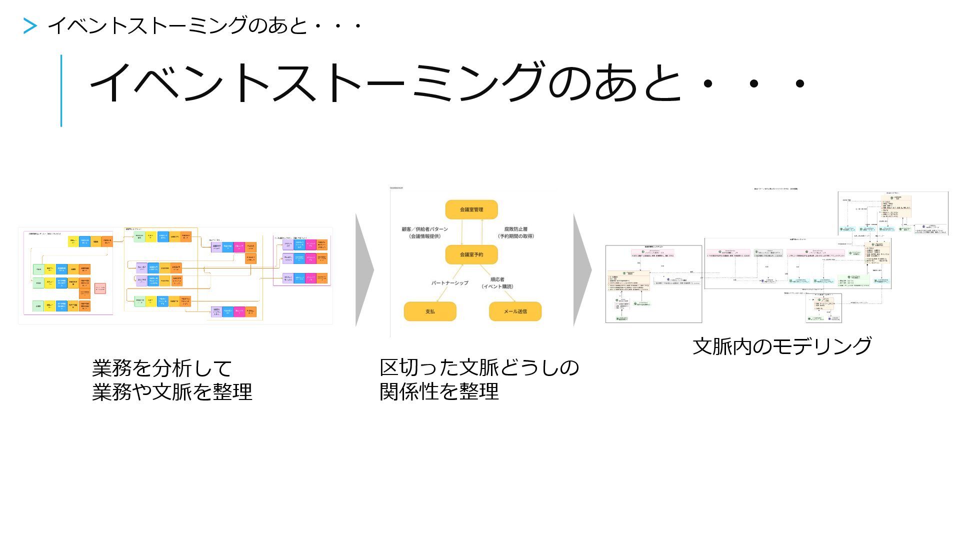 イベントストーミングのあと・・・ > イベントストーミングのあと・・・ 業務を分析して 業務や文脈を整理 区切った文脈どうしの 関係性を整理 文脈内のモデリング