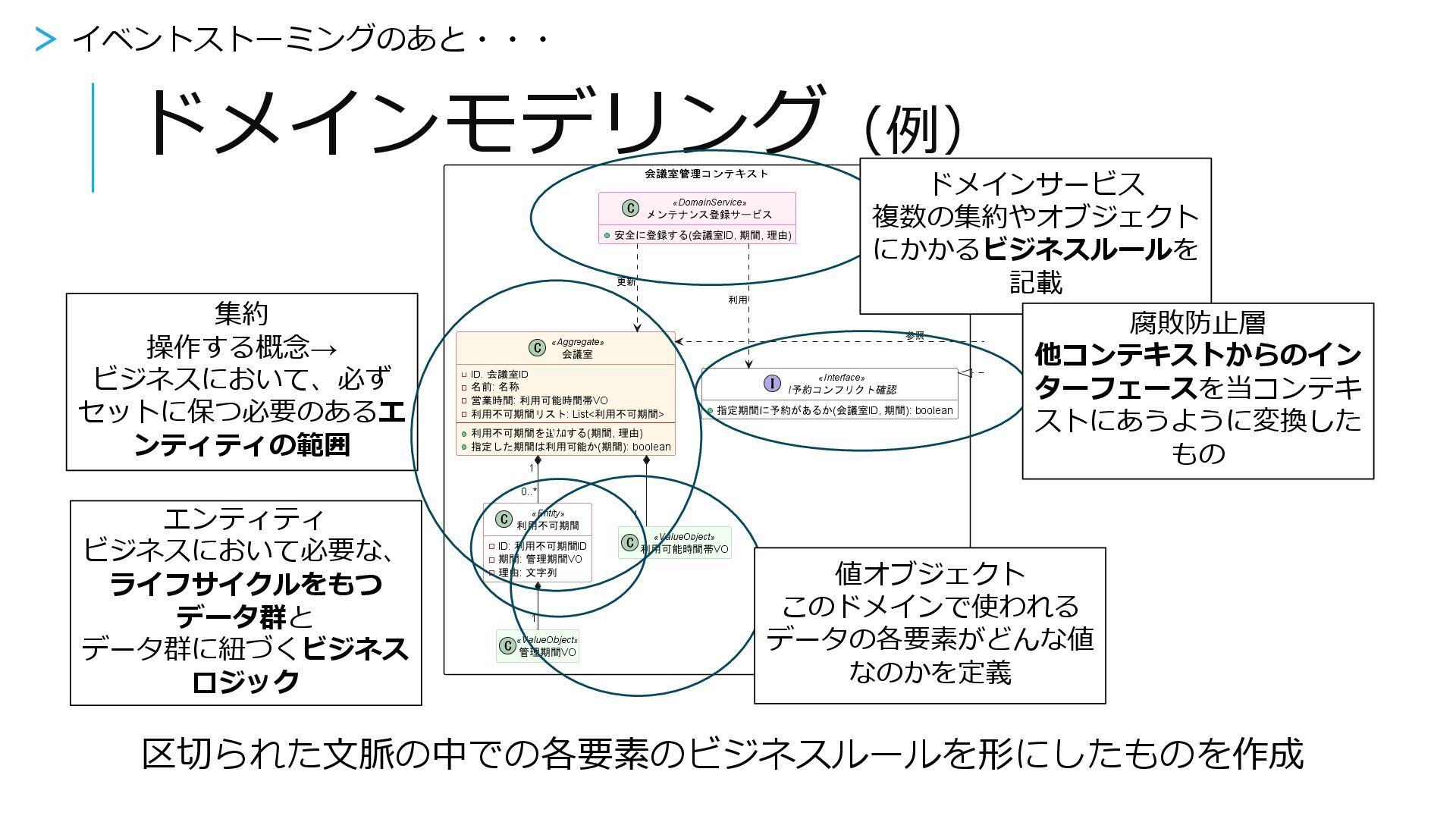 腐敗防止層 他コンテキストからのイン ターフェースを当コンテキ ストにあうように変換した もの 集約 操作する概念→ ビジネスにおいて、必ず セットに保つ必要のあるエ ンティティの範囲 エンティティ ビジネスにおいて必要な、 ライフサイクルをもつ データ群と データ群に紐づくビジネス ロジック ポリシー 業務 イベント コマンド コマンド 業務 イベント ポリシー 集約 ※諸説あります v > イベントストーミングのあと・・・