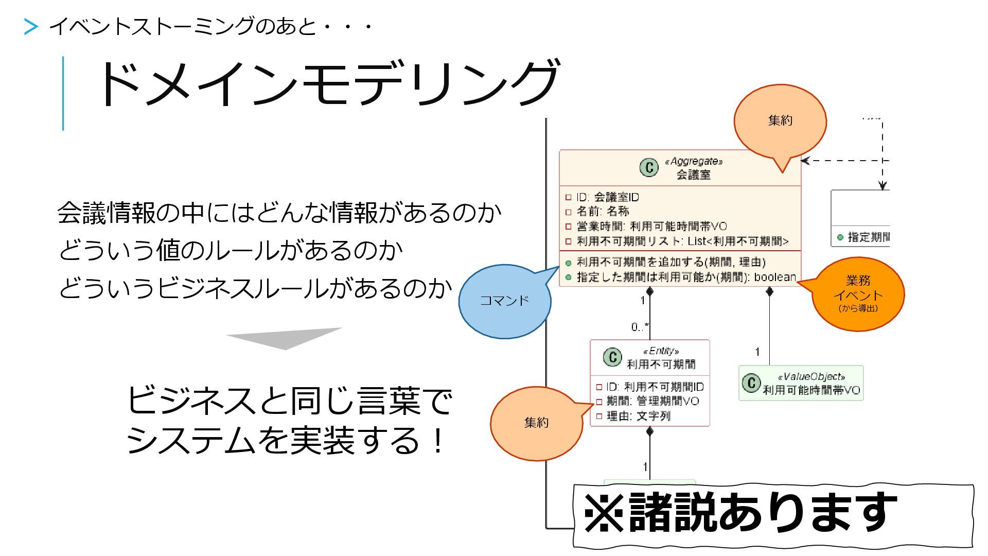 ドメインモデリング 会議情報の中にはどんな情報があるのか どういう値のルールがあるのか どういうビジネスルールがあるのか ビジネスと同じ言葉で システムを実装する! 集約 コマンド 業務 イベント