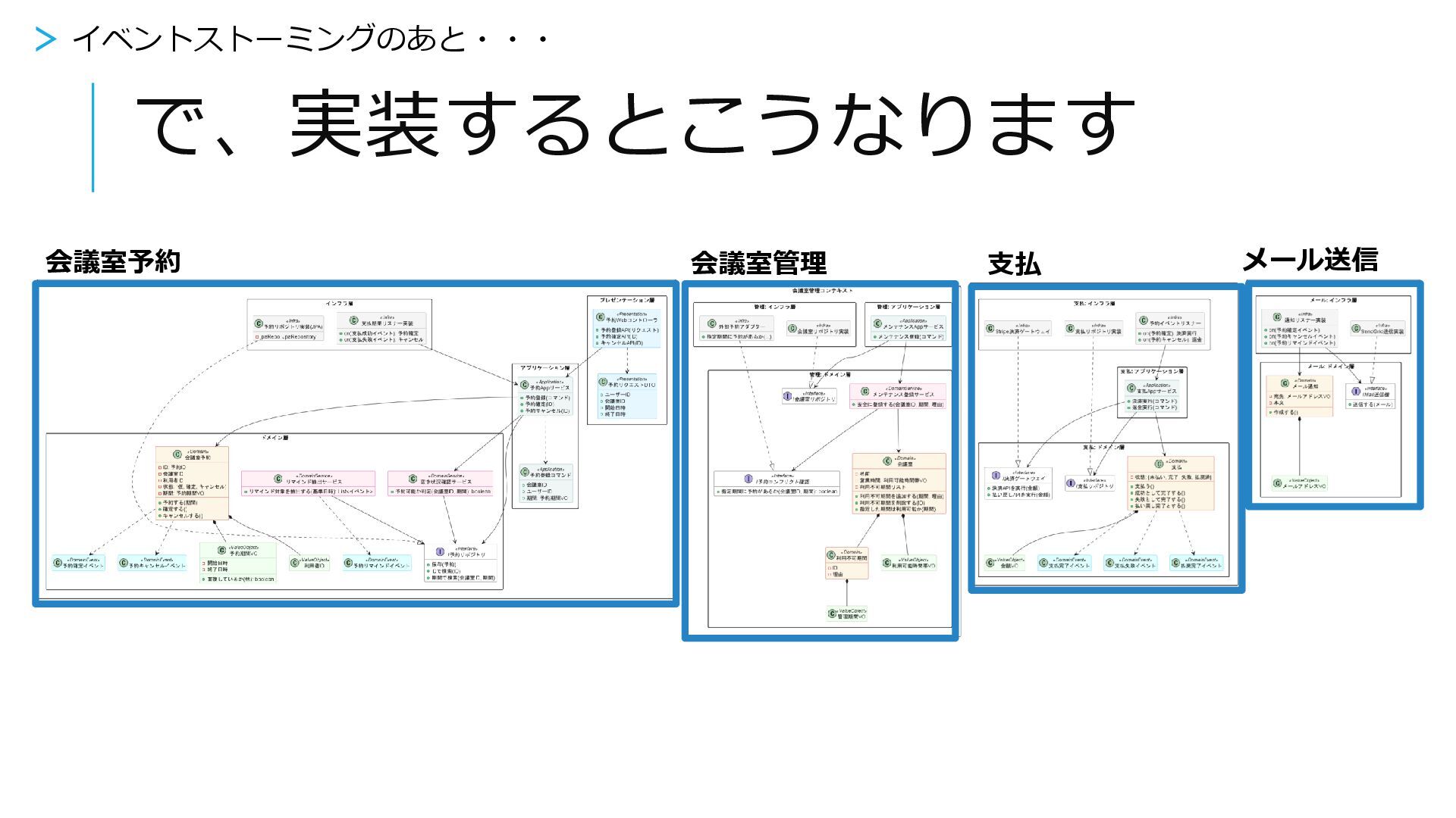 で、実装するとこうなります > イベントストーミングのあと・・・ 会議室予約 支払 メール送信 会議室管理