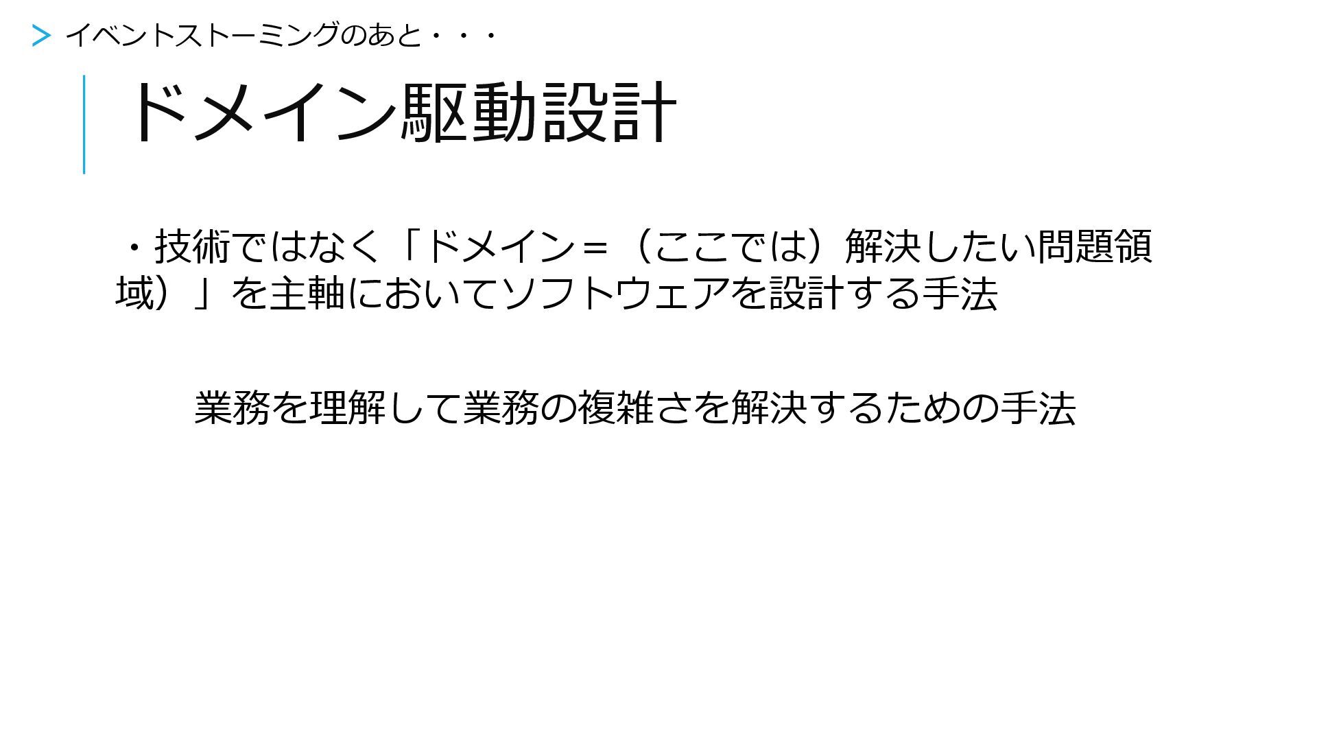 ドメイン駆動設計 ・技術ではなく「ドメイン=(ここでは)解決したい問題領 域)」を主軸においてソフトウェアを設計する手法 業務を理解して業務の複雑さを解決するための手法 > イベントストーミングのあと・・・