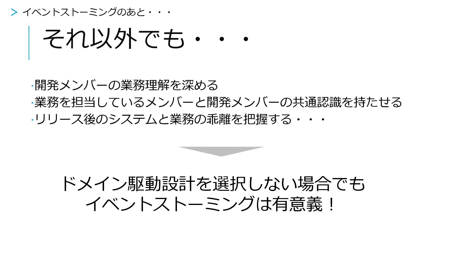 それ以外でも・・・ ∙開発メンバーの業務理解を深める ∙業務を担当しているメンバーと開発メンバーの共通認識を持たせる ∙リリース後のシステムと業務の乖離を把握する・・・ > イベントストーミングのあと・・・ ドメイン駆動設計を選択しない場合でも イベントストーミングは有意義!