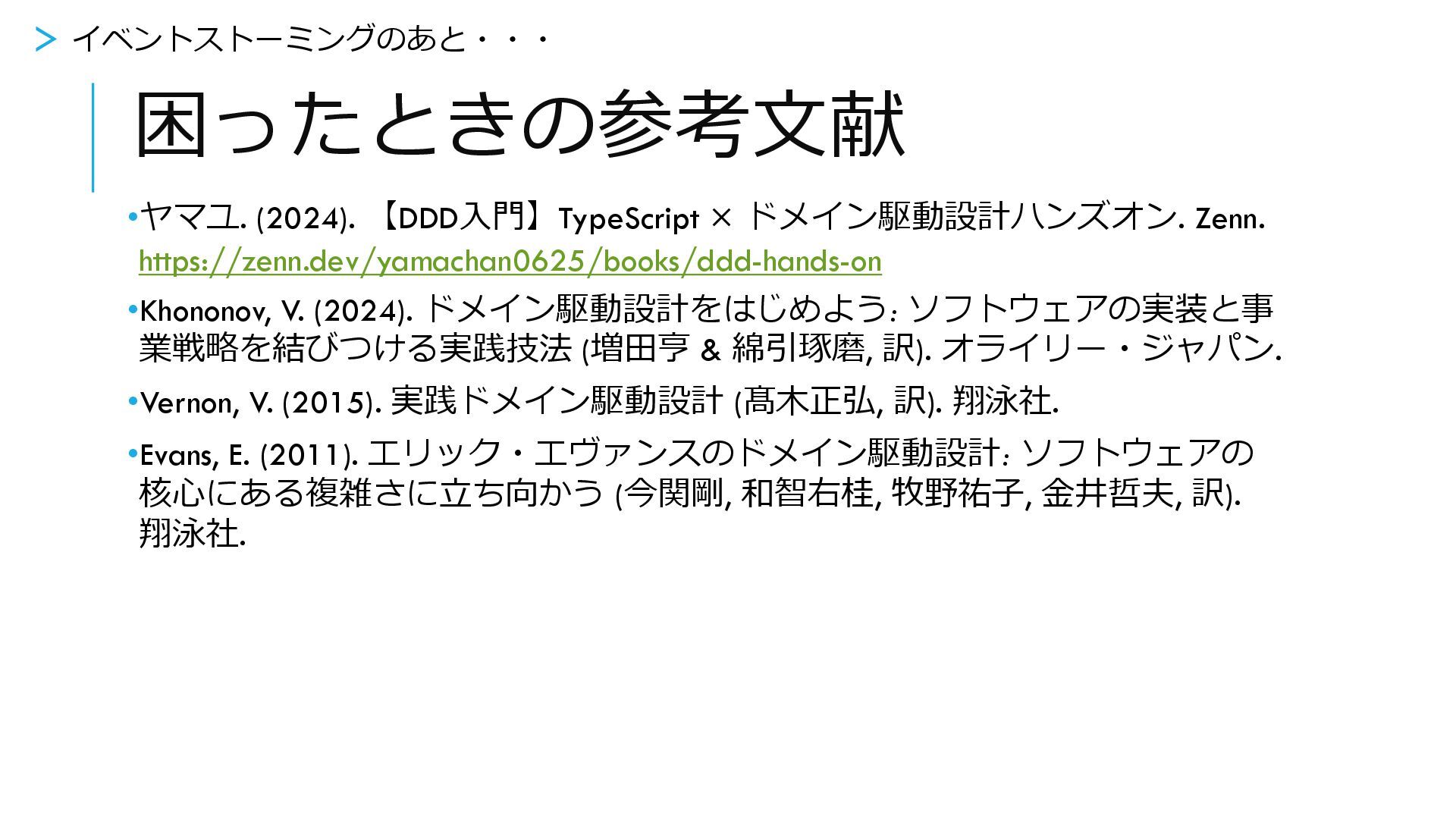 困ったときの参考文献 •ヤマユ. (2024). 【DDD入門】TypeScript × ドメイン駆動設計ハンズオン. Zenn. https://zenn.dev/yamachan0625/books/ddd-hands-on •Khononov, V.