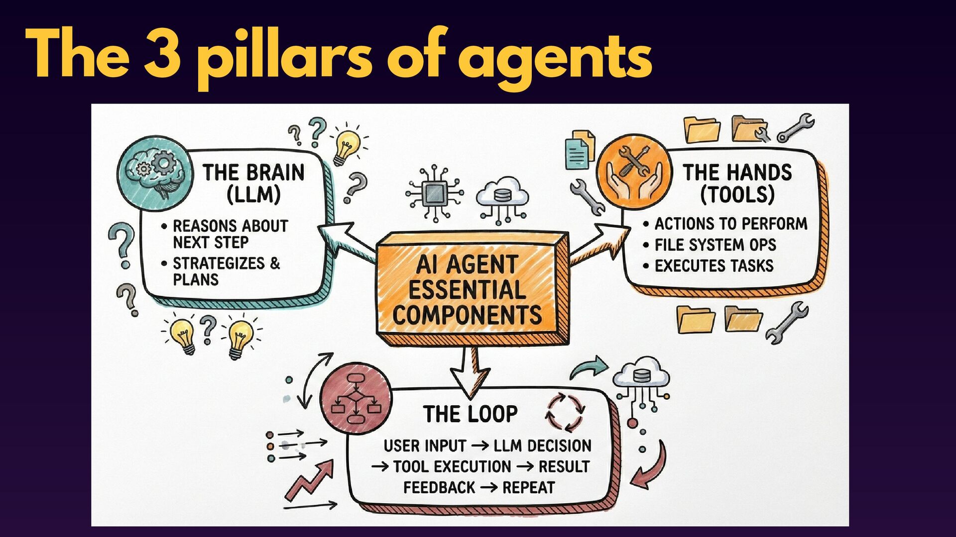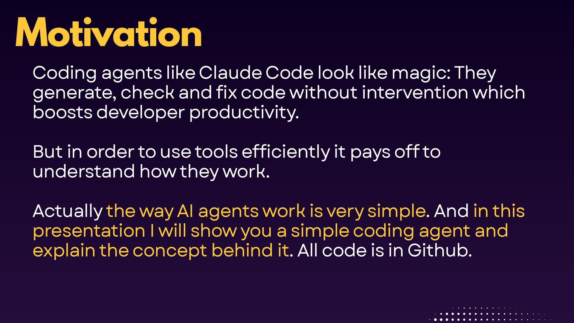 Actually the way AI agents work is very simple. And in this presentation I will show you a simple coding agent and explain the concept behind it. All code is in Github.