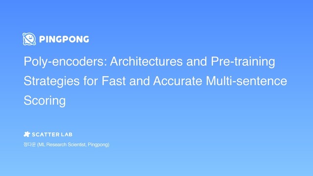 where • , Reply ߭ఠо Query, Context ߭ఠо Key, Valueੋ Attention ো c1 , . . . , cm yi ctxt = ∑ j wci j hj (wci 1 , . . . , wci N ) = softmax(ci h1 , . . . , . ci hN ) yctxt = ∑ i wi yi ctxt (w1 , . . . , wm ) = softmax(ycandi y1 ctxt , . . . , . ycandi ym ctxt ) Poly-encoders: Architectures and Pre-training Strategies for Fast and Accurate Multi-sentence Scoring Poly-Encoder (2/2)