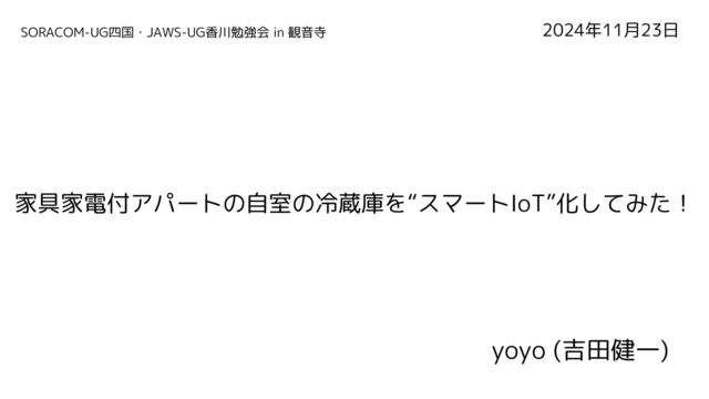 家具家電付アパートの自室の冷蔵庫を“スマートIoT”化してみた! 2024年11月23日 yoyo (吉田健一) SORACOM-UG四国・JAWS-UG香川勉強会 in 観音寺