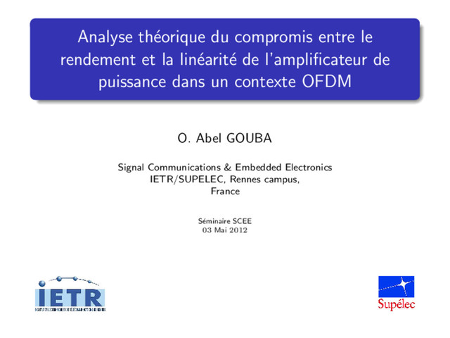 Conclusion References References I [1] O. A. Gouba and Y. Louet “Predistortion Performance considering Peak to Average Power Ratio Reduction in OFDM context”, in IEEE WCNC 2012, Paris, France, Apr. 2012. [2] C. Langlais, S. Haddad, Y. Louet and N. Mazouz “Clipping noise mitigation with the capacity approaching FEC codes for PAPR reduction of OFDM signals”, in MC-SS 2011, Herrshing, Germany, May 2011. [3] P. Banelli, G. Leus, and G. B. Giannakis, “Bayesian Estimation of Clipped Gaussian Processes with Application to OFDM”, in Proc. EUSIPCO, vol.1, pp.181-184, Sep. 2002. 22/24
