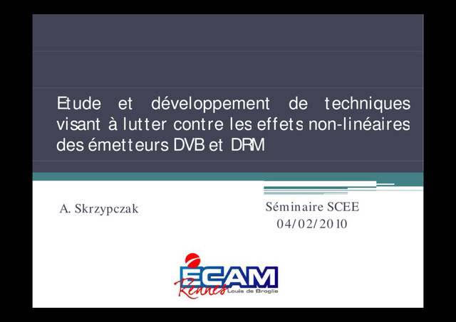 industriel avec le milieu académique milieu académique. Partenaires industriels: Digidia: basé au Rheu (35) spécialisé dans les solutions Digidia: basé au Rheu (35), spécialisé dans les solutions de radio numérique (DAB, DRM, DRM+). TeamCast: basé à St Grégoire (35), constructeur de modulateurs de TV numérique (DVB-T/H, FLO, DTMB). P t i dé i Partenaires académiques: Supélec (Cesson-Sévigné 35). ECAM Rennes Louis de Broglie (Bruz 35) ECAM Rennes – Louis de Broglie (Bruz 35).