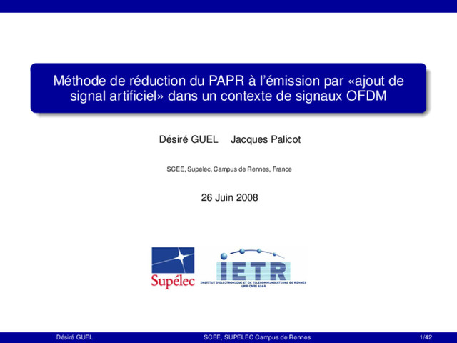 linéaire: Le Modèle de Rapp [1] dont les caractéristiques AM/AM et AM/PM sont données par: A (r) = r " 1+ „ r A0 «2p# 1 2p , Φ (r) = 0 0 5 10 15 10−4 10−3 10−2 10−1 Eb/N0 (in dB) Bit Error Rate (BER) for MAQ−16 BER, IBO=3 dB BER, IBO=6 dB BER, IBO=9 dB BER conventionnel 0 0.2 0.4 0.6 0.8 1 −40 −30 −20 −10 0 10 20 30 40 Normalised Frequency Power Spectrum Magnitude (dB) DSP, OFDM befor HPA DSP,OFDM, IBO=3 dB DSP,OFDM, IBO=6 dB DSP,OFDM, IBO=9 dB A. M. Saleh, Frequency-independent and frequencydependent nonlinear models of TWT amplifiers, IEEE Trans. Commun. vol. COM-29, No. 11, pp. 1715-1720, 1981. Désiré GUEL SCEE, SUPELEC Campus de Rennes 10/42