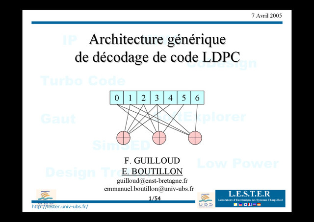 de LDPC ? Représentation algébrique : X = (x0 , x1 , …, x6 )T mot de code si H.X = 0 0 1 1 1 1 0 0 1 0 1 1 0 1 0 1 1 0 1 0 0 1 H = 0 1 2 3 4 5 6 Matrice de parité Nombre de 1 sur une ligne = dc=nombre de bit associé au PC Nombre de 1 sur une ligne = dv=nombre de PC associé à la bit N=nombre de bits P=nombre de PC Moins de 1% des bits de H sont égaux à 1
