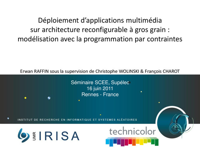 Borin, C. de Souza et G. Araujo : Efficient datapath merging for partially reconfigurable architectures. IEEE Transactions on Computer-Aided Design of Integrated Circuits and Systems, 24(7):969–980, 2005. - Corazao (1996) : M. R. Corazao, M. A. Khalaf, L. M. Guerra, M. Potkonjak et J. M. Rabaey : Performance optimization using template mapping for datapath-intensive high-level synthesis. IEEE Transactions on Computer- Aided Design of Integrated Circuits and Systems, 15:877–888, 1996. [Martin10] : K. Martin : Génération automatique d’extensions de jeux d’instructions de processeurs. Thèse de doctorat, Université de Rennes 1, 2010. - [DSD09] : C. Wolinski, K. Kuchcinski, E. Raffin et F. Charot : Architecture-driven synthesis of reconfigurable cells. In Proceedings of the 12th EUROMICRO Conference on Digital System Design Architectures, Methods and Tools (DSD ’09), 2009. - [TODAES10] : C. Wolinski, K. Kuchcinski et E. Raffin : Automatic design of application specific reconfigurable processor extensions with UPaK synthesis kernel. ACM Transactions on Design Automation of Electronic Systems (TODAES), 15:1–36, 2009. - [Raf10] : E. Raffin, C.Wolinki, F. Charot, K. Kuchcinski, S. Guyetant, S. Chevobbe et E. Casseau : Scheduling, binding and routing system for a run-time reconfigurable operator based multimedia architecture. In Proceedings of IEEE Conference on Design and Architectures for Signal and Image Processing (DASIP), October 2010.