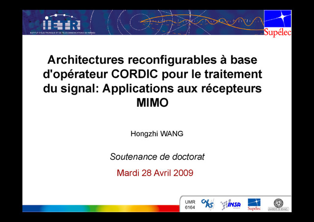 l’algorithme SRA (1) g M M M P H 2 / 1 1 1 M 1 0 Q = Q P1/2 = M i M i M M i M i M P P P 2 / 1 2 / 1 2 / 1 0 M N i N i M M i M M M i M i Q e P P H 1 1 2 / 1 1 1 2 / 1 1 1 0 1 M N i M M i Q P 2 / 1 0 i M1 Unitary transformation H P1/2 Q a M2 Unitary transformation i i M3 Unitary transformation i input data Modules M1, M2, M3 basés sur CORDIC r s i P w i M4 Calculation of M5 Calculation of M6 Interferences p i Q* a ri p Modules M4, M5, M6 basés sur PE (MAC) output data nulling vectors yi and si Cancellation basés sur PE (MAC) w i = p i q* ,i ri-i = ri -h i ŝ i y i = w i r ŝ i = decision( y i ) (1) Hongzhi Wang 28/04/2009 17 (1)H. WANG, P. LERAY, J. PALICOT, Reconfigurable architecture for MIMO systems based on CORDIC operators, Comptes Rendus Physique, Elsevier, volume 7 septembre 2006, pp 735-750.