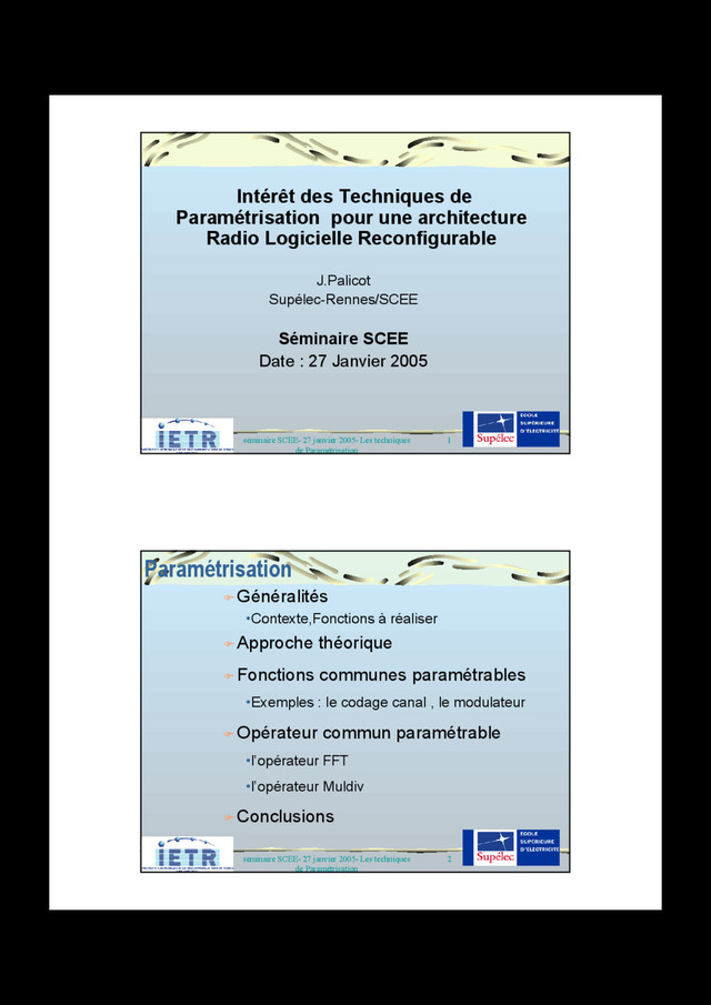 Standards Nombre d'opérateurs 802.11g G CRC16 (D)=D16+D12+D5+1 16 SR, 3 XOR GSM (1a) g CRC3 (D)=D3+D+1 (1b) g CRC8 (D)=D8+D4+D3+D2+1 (2) g CRC6 (D)=D6+D5+D3+ D2+D +1; (3) g CRC40 (D)=(D23+1)(D17+D3+1) (1) 3 SR, 2XOR (1b) 8 SR, 4XOR (2) 6 SR, 5 XOR (3) 40 SR, 5XOR UMTS (1) g CRC24 (D)=D24+D23+D6+D5+D+1 (2) g CRC16 (D)=D16+D12+D5+1 (3)g CRC12 (D)=D12+D12+D5+1; (4) g CRC8 (D)=D8+D7 +D4 +D3 +D+1 (1) 24 SR, 5XOR (2) 16 SR, 3 XOR (3) 12 SR, 3 XOR (4) 8 SR, 5 XOR Total opérateurs tri-standards 168 Avec MDIV 4 MDIV, 1 XOR (1) 3 MDI, 1 XOR (1b) 2 MDIV, 1 XOR (2) 1 MDIV, 2 MDI, 1 XOR (3) 10 MDIV, 1 XOR 1) 6 MDIV, 1 XOR (1b) 4 MDIV, 1 XOR (2) 3 MDIV, 1 XOR (3) 4 MDIV, 1 XOR 48 60 séminaire SCEE- 27 janvier 2005- Les techniques de Paramétrisation Code Reed-Solomon ) ) ( ) ( ( ) ( ) ( x g x M x reste x M x x C k n k n − − + = r r r r x g x g x g g x h x h x h h x G x H x T ] [ ] [ ] [ ] [ ] [ ] [ ] [ ] [ ) ( ) ( ) ( 2 2 1 0 2 2 1 0 + + + + + + + + = = K K x(n) y(n) [-g0 ] [-g1 ] [-g2 ] [-g3 ] [hr ] [hr-1 ] [h3 ] [h2 ] [h1 ] [h0 ] Z-1 Z-1 Z-1 Z-1 8bits 8bits [-gr-1 ] mul_div [g] [x] [h] [s] _8 L’opérateur MULDIV 6/11 Codes Cycliques 3/5