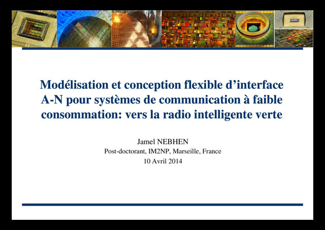 65 65 65 65 Supply (V) 2.5 1.2 0.9 0.5 1 fs (MHz) 3.072 12 0.25 0.5 3.072 BW 20Hz- 20Hz- 500Hz 500Hz 24kHz Mesure de SNR et de SNDR Comparaison avec l’état de l’art Conception d’un LNA (15/15) Conception d’un LNA (15/15) BW 20Hz- 20kHz 20Hz- 2kHz 500Hz 500Hz 24kHz SNR (dB) 92.5 77 80 75 88 SNDR (dB) 91 74 76 65 92 DR (dB) 93.5 95 68 72 93 THD (dB) 83 82 80 - - OSR 120 300 250 500 64 Power (mW) 0.3 2.2 2.1 0.25 0.25 1- [Dorrer, ESSCIRC 2006] 2- [Yeknami, IEEE Transaction Cir. Syst 2013] 3- [Liu, VLSI Design 2013] 4- [Luo, IEEE JSSC 2013] [Nebhen, IEEE SENSORS 2013] SNR = 92.5 dB SNDR = 91 dB DR = 93.5 dB 33