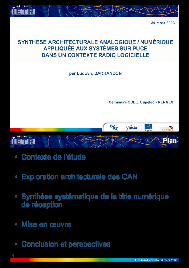 K\SHUEROLTXH LQYHUVH (UUHXU GH JDLQ ( ) ( ) )7 )7 1/ 1/ 1/ WDQK WDQK α α − = )7 )7 JDLQ ε ε + = $UFKLWHFWXUH ,PSHUIHFWLRQV &RPS 1/, 1/' 6)'5 61'5 )'0 (VSDFH GH FRQFHSWLRQ 5pDOLVDWLRQ HW YDOLG 6SpFLILFDWLRQV ([SORUDWLRQ DUFKL 0RGpOLVDW &DOFXO GH OD 1/, j SDUWLU GHV LPSHUIHFWLRQV &DOFXO GH OD 1/, j SDUWLU GHV LPSHUIHFWLRQV εJDLQ HUUHXU UHODWLYH GH JDLQ α1/ ³DPSOLWXGH´ GH OD QRQ OLQpDULWp ( ) ( ) ( ) L L 1/ 1/ JDLQ [ [ L 1/, − ⎟ ⎟ ⎠ ⎞ ⎜ ⎜ ⎝ ⎛ ⎟ ⎟ ⎠ ⎞ ⎜ ⎜ ⎝ ⎛ − = − WDQK WDQK α α ε [L SRVLWLRQ LGpDOH GX LqPH SDOLHU 1/, L 1/, FRUUHVSRQGDQW j [L 1/, G¶XQ pWDJH SLSHOLQH QRQ LGpDO /D 1/, JOREDOH G¶XQ &$1 SLSHOLQH HVW OD VRPPH GHV FRQWULEXWLRQV GH FKDTXH pWDJH j FHWWH 1/, ∑ − = = 0 pWDJH pWDJH JOREDO 1/, 1/, ,, ([SORUDWLRQ DUFKLWHFWXUDOH GHV &$1 / %$55$1'21 ± PDUV $UFKLWHFWXUH ,PSHUIHFWLRQV &RPS 1/, 1/' 6)'5 61'5 )'0 (VSDFH GH FRQFHSWLRQ 5pDOLVDWLRQ HW YDOLG 6SpFLILFDWLRQV ([SORUDWLRQ DUFKL 0RGpOLVDW 3DUDP 3DUDPq qWUHV H[WUDLWV GH OD 1/, WUHV H[WUDLWV GH OD 1/, ( ) ( ) ( ) − − − − + + + − + L L L L L L 1/, 1/, T 1/, 1/, 1/, 1/, T T G9 9 L L ,1/ T ,1/ T LQ LQ L = = ∫ + + − − ε ,, ([SORUDWLRQ DUFKLWHFWXUDOH GHV &$1 (WDJHV 1 ELWV 1 FRPSDUDWHXUV (WDJHV ELW FRPSDUDWHXUV 1LYHDX[ GHV KDUPRQLTXHV FDOFXOpV SDU GpYHORSSHPHQW HQ VpULHV GH )RXULHU ( ) ( ) ( ) ( ) [ ] ∑ = + − − − = Q L L L L N [ N [ N \ N D FRV VLQ FRV VLQ π [ L SDOLHUV DYHF 1/' \ L [ L [ L 6)'5 KDUPRQLTXH OD SOXV SXLVVDQWH 3XLVVDQFH GX VLJQDO G¶HQWUpH (UUHXU TXDGUDWLTXH PR\HQQH GH OD VRUWLH DYHF 1/, 61'5