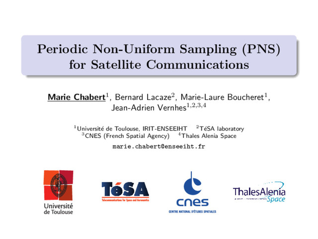 Blind PNS delay estimation4 Principle: stationarity property Property: wide sense stationarity of the reconstructed signal X( ˜ ∆) = {X( ˜ ∆)(t), t ∈ R} if and only if ˜ ∆ = ∆. In particular: P( ˜ ∆)(tm ) = E X( ˜ ∆) (tm ) 2 , tm = m M + 1 , m = 1, ..., M independent of tm. Strategy: estimation of the reconstructed signal power P( ˜ ∆)(tm ) for m = 1, ..., M for different values of ˜ ∆: P( ˜ ∆)(tm ) = 1 N N 2 n=− N 2 X( ˜ ∆) (n + tm ) 2 , m = 1, ..., M. 4J.-A. Vernhes et al. “Estimation du retard en ´ echantillonnage p´ eriodique non uniforme - Application aux CAN entrelac´ es d´ esynchronis´ es”. In: GRETSI 2015. Marie Chabert IRIT-ENSEEIHT – T´ eSA – CNES – TAS Periodic Non-Uniform Sampling (PNS) for Satellite Communications 40 / 44