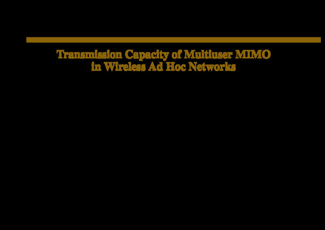 Andrews, “Capacity Scaling of SDMA in Wireless Ad Hoc Networks", in Proc. ITW’09 and journal pre-submission. Most-Related Prior Work: [WebAndJin’07] S. Weber, J. G. Andrews, and N. Jindal, “The effect of fading, channel inversion, and threshold scheduling on ad hoc networks," IEEE Trans. Inform. Theory, vol. 53, no. 11, pp. 4127-4149, Nov. 2007. [WebAndJin’08] S. Weber, J. G. Andrews, and N. Jindal, “Transmission capacity: applying stochastic geometry to uncoordinated ad hoc networks," arxiv.org/abs/0809.0016. [Huang et al.’08] K. Huang, J. G. Andrews, R. W. Heath, Jr., D. Guo, and R. A. Berry, “Spatial Interference Cancellation for Multi-Antenna Mobile Ad Hoc Networks", submitted to IEEE Trans. on Information Theory, July 2008. (on Arxiv). [HunAndWeb ’08] A. M. Hunter, J. G. Andrews, and S. P. Weber, “Transmission capacity of ad hoc networks with spatial diversity," IEEE Trans. on Wireless Communications, Vol. 7, No. 12, pp. 5058-71, Dec. 2008. SUPELEC - SCEE Seminar – p. 23/23