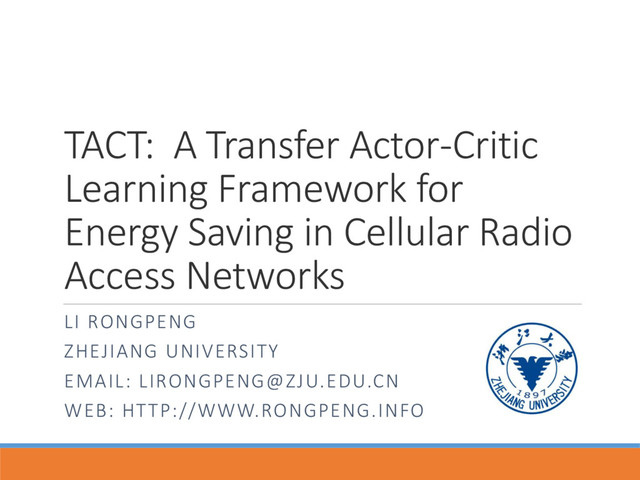region ℒ ∈ ℝ2 served by a set of BSs ℬ = {1, … , Controller: a BS switching operation controller to turn on/off some BSs in a centralized way; A traffic load density as = ) ( ) ( < ∞: arrival rate per unit area ) ( and file size 1 ) ( . Traffic load within BS 's coverage: = ℒ () (, ℬ )d (, ℬ ) = 1 denotes location is served by BS ∈ , vice versa. BS Switching Operation Controller Action BS 1: Active ⁞ BS i: Sleeping ⁞ BS N: Active Cost State Environment • Rongpeng Li, Zhifeng Zhao, Xianfu Chen, Jacques Palicot, and Honggang Zhang, “TACT: A Transfer Actor-Critic Learning Framework for Energy Saving in Cellular Radio Access Networks,” summited to IEEE Transactions on Wireless Communications (Second Round Review). • Rongpeng Li, Zhifeng Zhao, Xianfu Chen, and Honggang Zhang, “Energy Saving through a Learning Framework in Greener Cellular Radio Access Networks,” in Proceedings of IEEE Globecom 2012, Anaheim, California, USA, Dec. 2012.