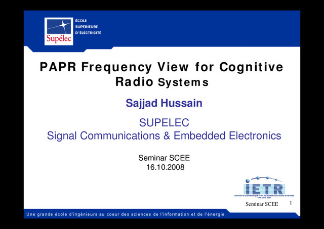 -With the help of this view we can : - Estimate the spectrum access influence on global PAPR with the help of individual frequential PAPR -Optimize some of these added carriers for PAPR mitigation (while the others to transmit useful data) Standard 1 Standard 2 Carriers for PAPR mitigation Carriers for data Possible methods : TR, Geometrical tone adding method (1) (1) D Guel, J Palicot, Y Louët, “A Geometric Method for PAPR Reduction in a Adding Signal in context for OFDM Signals”, International Conference on Digital Signal Processing, DSP 2007, 1-5 July 2007, Cardiff, UK