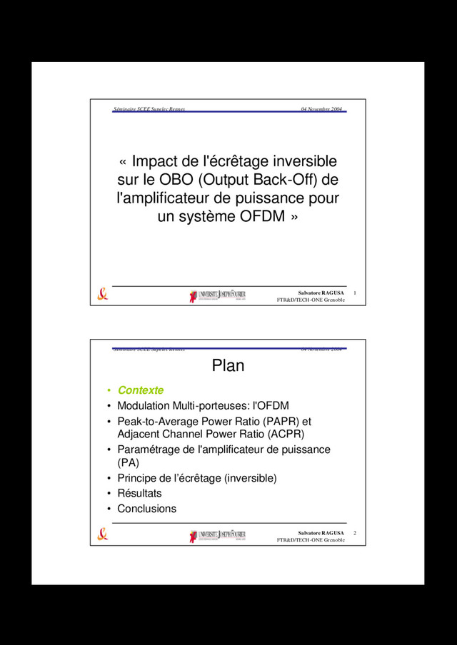 2004 71 Bibliographie • R. E. Ziemer, M. A. Wickert, « Link design for third-generation wireless systems for rural communities using OFDM and ATM », IEEE 47th Vehicular Technology Conference, vol. 3, May 1997, pp. 1649 - 1653 • R. W. Chang, « Synthesis of band-limited orthogonal signals for multichannels data transmission », Bell Syst. Tech. J., vol. 45, Dec.1966, pp. 1775- 1796 • T. Keller, L. Piazzo, P. Mandarini and L. Hanzo, « Orthogonal Frequency Division Multiplex Synchronization Techniques for Frequency-Selective Fading Channels », IEEE Journal on Selected Areas in Communications, vol. 19, No. 6, Jun. 2001, pp. 999-1008 • N. Dinur, D. Wulich, « Peak-to-Average Power Ratio in High-Order OFDM », IEEE Transactions on Communications, vol. 49, No. 6, Jun. 2001, pp. 1063-1072 Séminaire SCEE Supelec Rennes Salvatore RAGUSA FTR&D/TECH-ONE Grenoble 04 Novembre 2004 72 Bibliographie • Li, X. and Ritcey, J.A., « m-sequences for OFDM PAPR reduction and error correction », Electronic Letters, Vol. 33, pp. 545-546, 1997 • Baml, R.W., Fischer, R.F.H. and Huber, J.B., « Reducing the Peak to Average Power Ratio of Multicarrier Modulation by Selected Mapping », IEE Electronics Letters, Vol. 32, No. 22, Sept. 1997, pp 2056-2057
