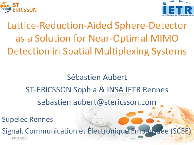 ″Factoring Polynomials with Rational Coefficients,″ Mathematica Annalen, vol. 261, pp. 515-534, 1982. [Sey93] M. Seysen, ″Simultaneous Reduction of a Lattice Basis and its Reciprocal Basis,″ Combitanorica, vol. 13, pp. 363-376, 1993 [AEVZ02] E. Agrell, T. Eriksson, A. Vardy, and K. Zeger, ″Closest Point Search in Lattice,″ Information theory, IEEE Transactions on, vol. 48, no. 8, pp. 2201-2214, Nov. 2002. [WTCM02] K.-W. Wong, C.-Y. Tsui, R.S.-K. Cheng, and W.-H. Mow, ″A VLSI Architecture of a K-Best Lattice Decoding Algorithm For MIMO Channels,″ Symposium on Circuits and Systems, IEEE International, vol. 3, pp 273–276, 2002. [WBKK03] D. Wübben, R. Böhnke, V. Kühn, and K.-D. Kammeyer, ″ MMSE Extension of V-BLAST Based on Sorted QR Decomposition,″ Vehicular Technology Conference, IEEE , vol. 1, pp. 508–512, Oct. 2003. [WBKK04] D. Wübben, R. Bohnke, V. Kuhn, and K.-D. Kammeyer, ″Near-Maximum-Likelihood Detection of MIMO Systems using MMSE-based Lattice Reduction,″ International Conference on Communications, IEEE, vol.2, pp. 798-802, June 2004. [GN04] Z. Guo, and P. Nilsson, ″ A VLSI Architecture of the Schnorr-Euchner Decoder for MIMO Systems,″ Circuits and Systems Symposium on Emerging Technologies: Frontiers of Mobile and Wireless Communication, IEEE, vol. 1, pp. 65-68, June 2004. 29/11/2010 40