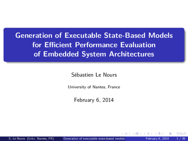 . .. . . . . .. . . . .. . . . .. . . . .. . . . . .. . . . .. . . . .. . . . .. . . . . .. . . . .. . . . .. . . . .. . . . . .. . . . .. . . . . .. . . . .. . . . .. . References I [1] R. Dömer, A. Gerstlauer, J. Peng, D. Shin, L. Cai, H. Yu, S. Abdi, and D. Gajski, “System-on-chip environment: A specc-based framework for heterogeneous mpsoc design,” EURASIP Journal on Embedded Systems, vol. 2008, 2008. [2] A. D. Pimentel, C. Erbas, and S. Polstra, “A systematic approach to exploring embedded system architectures at multiple abstraction levels,” IEEE Transaction on Computers, vol. 55, 2006. [3] C. Haubelt, J. Kalk, J. Keinert, T. Schlichter, M. Streubühr, A. Deyhle, A. Hadert, and J. Teich, “A systemc-based design methodology for digital signal processing systems,” EURASIP Journal on Embedded Systems, vol. 2007, 2007. [4] F. Balarin, Y. Watanabe, H. Hsieh, L. Lavagno, C. Passerone, and A. Sangiovanni-Vincentelli, “Metropolis: an integrated electronic system design environment,” Computer, vol. 36, pp. 45–52, April 2003. [5] T. Arpinen, E. Salminen, T. D. Hämäläinen, and M. Hännikäinen, “Performance evaluation of uml-2modeled embedded streaming applications with system-level simulation,” EURASIP Journal on Embedded Systems, vol. 2009, 2009. [6] J. Kreku, M. Hoppari, T. Kestilä, Y. Qu, J. Soininen, P. Andersson, and K. Tiensyrjä, “Combining uml2 application and systemc platform modelling for performance evaluation of real-time embedded systems,” EURASIP Journal on Embedded Systems, vol. 2008, pp. 6:1–6:18, jan 2008. [7] P. Bourgos, A. Basu, M. Bozga, S. Bensalem, J. Sifakis, and K. Huang, “Rigorous system level modeling and analysis of mixed hw/sw systems,” in IEEE/ACM International conference on Forma methods and models for codesign (MEMOCODE), 2011. [8] SpaceCodesign. Space studio. [Online]. Available: http://www.spacecodesign.com [9] Expermeta. [Online]. Available: http://www.expermeta.com [10] Mirabilis. Mirabilis visualsim. [Online]. Available: http://www.mirabilisdesign.com [11] Intel. Intel cofluent studio. [Online]. Available: http://www.intel.com/content/www/us/en/cofluent/intel-cofluent-studio.html S. Le Nours (Univ. Nantes, FR) Generation of executable state-based models February 6, 2014 38 / 39