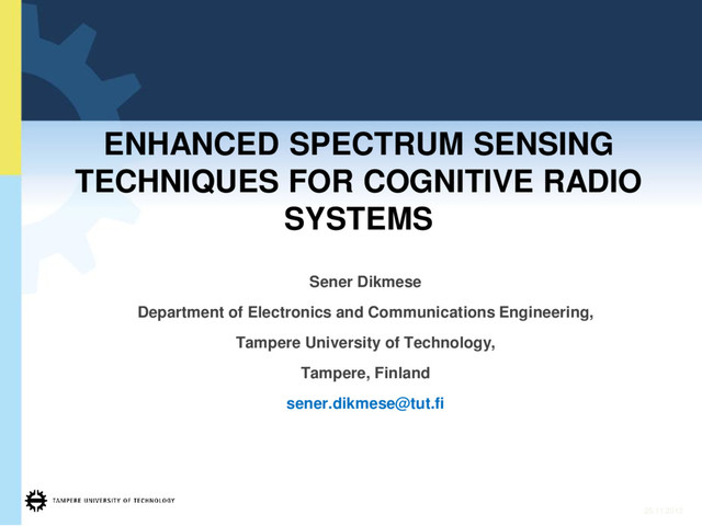 it appears at the FFT or AFB output sample in subband , and is the corresponding channel noise sample. and illustrate the absent hypothesis and present hypothesis of a primary user (PU), respectively. ¾ In this study, rectangular ¿lter window is used for its simplicity and lower computational complexity. In this case, the decision statistics at different frequencies can be calculated as 25.11.2013 AFB AND FFT BASED ENERGY DETECTOR ALGORITHMS Typically, the sampling rate of the subbands is equal to the ADC sampling rate divided by the number of channels in filter bank. In the spectrum sensing context, the subband signals can be expressed as 0 1 ( , ) ( , ) ( , ) ( , ) k W m k H Y m k S m k H W m k H ½ ® ¾ ¯ ¿ ( , ) S m k th m k ( , ) W m k 0 H 1 H 2 / 2 1 1 / 2 ( , ) ( , ) f t f k L m u m L l k L Y m k Y u l ª º « » « » ¬ ¼ ¦ ¦