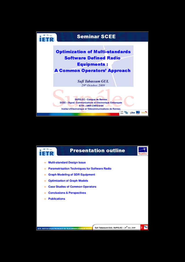 55 IETR - INSTITUT D’ÉLECTRONIQUE ET DE TÉLÉCOMMUNICATIONS DE RENNES Perspectives 6. Find new COs 7. Provide an industrial tool for designers of future SDR and CR equipments’ That allows to optimize multi-standards SDR design & That provides a choice to orientate the design towards high granularity or low granularity It is certainly interesting to follow the research directions mentioned above to further enhance the proposed ideas. Sufi Tabassum GUL- SUPELEC – 29 th Oct. 2009 56 IETR - INSTITUT D’ÉLECTRONIQUE ET DE TÉLÉCOMMUNICATIONS DE RENNES Publications International Journal Papers 1. S. T. Gul, Ali Al-Ghouwayel, C. Moy and Y. Louët, “A Novel Design of Reconfigurable Fourier Transform Operator Over C C and GF( GF(F Ft t ) ) for Future Multi-standards SDR Equipments,” International Journal of Communication Networks and Distributed Systems-IJCNDS, Accepted in June 2009 for publication by the end of 2009. 2. S. T. Gul, L. Alaus, C. Moy, J. Palicot and D. Noguet, “Optimal set of LFSR Common Operators for Multi- Standards Cognitive Radio Terminals,” International Journal of Autonomous and Adaptive Communications- IJAACS, Special Issue on Cognitive Radio Systems, Accepted in July 2009 for publication in 2010. 3. S. T. Gul, R. Mahesh, C. Moy, J. Palicot and A. P. Vinod “Filter Bank Techniques for SDR Channelizers and their Optimization using Graph Theoretical Approach,” EURASIP Journal on Advances in Signal Processing, Special Issue on Filter Banks for Next Generation Multicarrier Wireless Communications, Submitted, June, 2009. International Conference Papers 1. S. T. Gul, C. Moy and J. Palicot, “Graphical Modeling and Optimization of Air Interface Standards for Software Defined Radios,” 12th IEEE International Multitopic Conference-INMIC2008, Karachi, Pakistan, pp. 473-479, December 2008. 2. S. T. Gul, R. Mahesh, C. Moy, A. P. Vinod and J. Palicot, “A Graphical Approach for the Optimization of SDR Channelizers,” International Union of Radio Science (Union Radio Scientifique Internationale-URSI); XXIX General Assembly, Chicago, Illinois, USA, August 2008. 3. S. T. Gul, C. Moy and J. Palicot, “Two scenarios of flexible multi-standard architecture designs using a multi-granularity exploration,” The 18th Annual IEEE International Symposium on Personal, Indoor and Mobile Radio Communication- PIMRC’07, Athens, Greece, pp. 1-5, September 2007. International Conference Workshops 1. S. T. Gul, L. Alaus, D. Noguet, C. Moy and J. Palicot “The Common Operator Technique: An Optimization Process to Identify and Design a Set of Common Operators to Perform SDR Equipment (project NEWCOM++),” Dynamic Spectrum Management in Cognitive Radio Networks, ICT-MobileSummit 2009, Santander, Spain, June 2009.