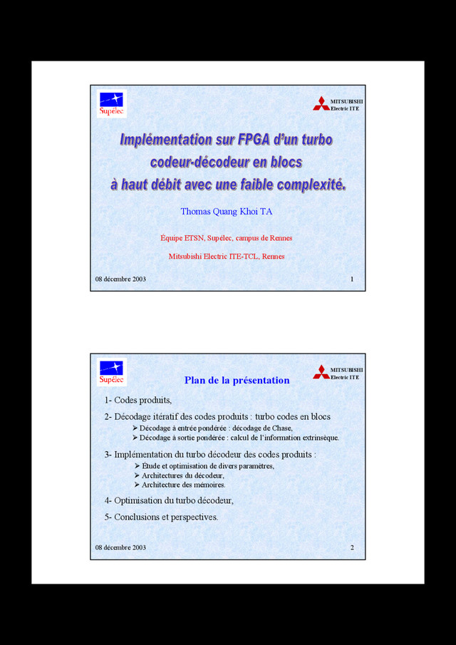 Introduits en 1954 par P. Elias, -Deux codes en bloc linéaires : C1 (n 1 , k 1 , d 1 ) et C2 (n 2 , k 2 , d 2 ), -Code produit C (n, k, d) = C1 ⊗ C2 , n = n 1 × n 2 , k = k 1 × k 2 , d = d 1 × d 2 , ¾ Construction relativement simple. ¾ Puissants codes correcteurs d’erreurs construits à partir de plusieurs codes en blocs linéaires de faibles pouvoirs de correction, 08 décembre 2003 4 MITSUBISHI Electric ITE Construction des codes produits [I] [M]: k 2 × n 1 C1 n 1 redondance sur les lignes n 2 [M] [C]: n 2 × n 1 C2 redondance sur la redondance redondance sur les colonnes k 1 k 2 matrice [I] des éléments binaires d’information