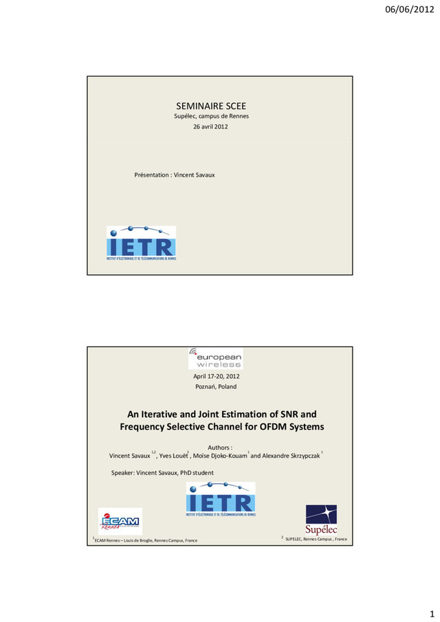 (SNR, noted ) , with the second moment‐order of the received signal [1]: estimated thanks to the subtraction of two consecutive received signal vectors [2]: estimated thanks to the subspace properties of the estimated covariance matrix of the received signal 5 G. Ren, H. Zhang, and Y. Chang, “SNR Estimation Algorithm Based on the Preamble for OFDM Systems in Frequency Selective Channels,” IEEE Transactions on Communications, vol. 57, no. 8, August 2009. X. Xu, Y. Jing, and X. Yu, “Subspace‐Based Noise Variance and SNR Estimation for OFDM Systems,” in IEEE Mobile Radio Applications Wireless Communication Networking Conference, March 2005, pp. 23 –26. [1] [2] Our solution: estimated thanks to the MMSE criterion 1.Background Estimation Methods ‐ Noise estimation MMSE criterion performed on the pilot (index ) ‐ = 2 2 6 In practice: approximation of MMSE criterion The noise variance estimation depends on the channel estimation quality