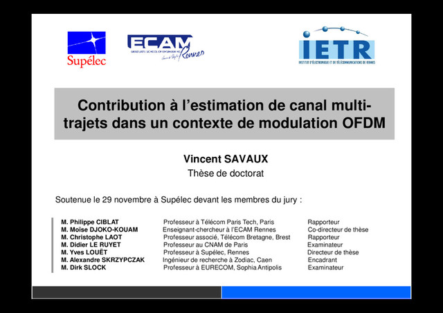 l’art sur les techniques d’estimation de canal Estimation de canal LMMSE par ajout d’un filtre de masquage Estimation conjointe et itérative du RSB et du canal Etude des interpolations sur l’estimation de canal de Rayleigh Conclusion, discussion et perspectives Rappel Présentation de l’algorithme Convergence de l’algorithme Résultats de simulations On peut appliquer LMMSE sans connaissance des moments d’ordres 2 du canal ni du bruit On atteint l’estimateur optimal pour l’estimation de canal Meilleur ratio performance d’estimation/nombre de pilotes que la littérature pour l’estimation de la variance du bruit Vincent SAVAUX Contribution à l’estimation de canal multi-trajets dans un contexte de modulation OFDM 35 Contributions : - V. SAVAUX , Y. LOUËT , M. DJOKO-KOUAM, A. SKRZYPCZAK “An iterative and joint estimation of SNR and frequency selective channel for OFDM systems”, European Wireless, april 2012, Poznań, Poland - V. SAVAUX , Y. LOUËT , M. DJOKO-KOUAM, A. SKRZYPCZAK “Application of a Joint and Iterative MMSE-based Estimation of SNR and Frequency Selective Channel for OFDM Systems”, EURASIP Journal on Advances in Signal Processing, 2013:128, july 2013. - V. SAVAUX , M. DJOKO-KOUAM, Y. LOUËT, A. SKRZYPCZAK “Convergence Analysis of a joint SNR and Channel Estimator for Frequency Selective Channels in OFDM Context”, submitted in IET Signal Processing, October 2013.
