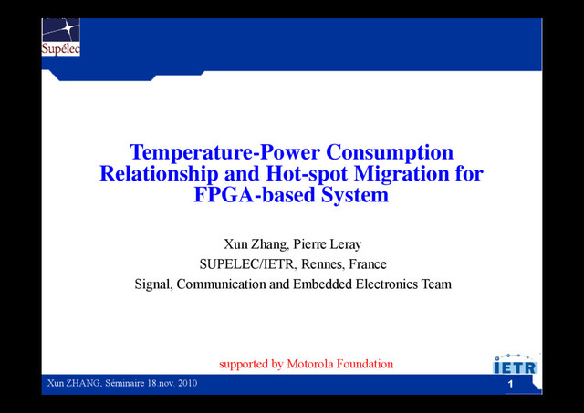 T C2 Busy T C2 Busy T C2 Busy T PE1 Thermal Sensor y PE2 Thermal Sensor y PE3 Thermal Sensor y PE4 Thermal Sensor y Migrating Hotspot Guarantee performance Guarantee performance Easily to identify PE location with NoC Overhead of configuration Circuit Parameters : Frequency, voltage, ... q y, g , The most efficient solution Decease performance Ring topology Green Workshop – 06 November 2009 IETR - INSTITUT D’ÉLECTRONIQUE ET DE TÉLÉCOMMUNICATIONS DE RENNES Une grande école d’ingénieurs au cœur des sciences de l’information, de l’énergie et des systèmes 30 Xun ZHANG, Séminaire 18.nov. 2010