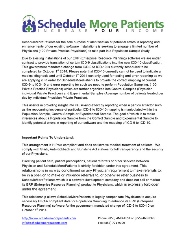 (855) 463-‐8378 [email protected] Fax: (855) 771-‐9109 ScheduleMorePatients for the sole purpose of identification of potential errors in reporting and enhancements of our existing software installations is seeking to engage a limited number of Physicians (100 Private Practice Physicians) to take part in a Population Sample Study. Due to existing installations of our ERP (Enterprise Resource Planning) software we are under contract to provide translation of certain ICD-9 classifications into the new ICD-10 classification. This government mandated change from ICD-9 to ICD-10 is currently scheduled to be completed by October 1st 2014. Please note that ICD-10 currently cannot be used to indicate a medical diagnosis and until October 1st 2014 can only used for testing and error reporting as we are applying it. In order for ScheduleMorePatients to provide the correct mapping of current ICD-9 to ICD-10 and error reporting for such we need to perform Population Sampling, (100 Private Practice Physicians) which are further organized into Control Samples (Physician individual Private Practices) and Experimental Samples (Average number of patients treated per day by individual Physician Private Practice). This assists in providing insight into cause-and-effect by reporting when a particular factor such as the reoccurring incidence of particular ICD-9 to ICD-10 mapping is manipulated within the Population Sample, Control Sample or Experimental Sample. The goal of which is to make inferences about a Population Sample from the Control Sample and Experimental Sample to identify potential errors in reporting of our software and the mapping of ICD-9 to ICD-10. Important Points To Understand: This arrangement is HIPAA compliant and does not involve medical treatment of patients. We comply with Stark, Anti-Kickback and Sunshine Act statues for full transparency and the security of our Physicians. Directing patient care, patient prescriptions, patient referrals or other services between Physician and ScheduleMorePatients is strictly forbidden under this agreement. This relationship is in no way conditioned on any Physician requirement to make referrals to, be in a position to make or influence referrals to, or otherwise refer business to ScheduleMorePatients which is a software development company and does not sell or market its ERP (Enterprise Resource Planning) product to Physicians, which is expressly forbidden under the agreement. This relationship allows ScheduleMorePatients to legally compensate Physicians to acquire necessary HIPAA compliant data for Population Sampling to enhance its ERP (Enterprise Resource Planning) software for the government mandated change of ICD-9 to ICD-10 on October 1st 2014.