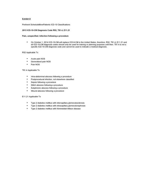 R52, T81.4, E11.21 Pain, unspecified, Infection following a procedure • On October 1, 2014 ICD-10-CM will replace ICD-9-CM in the United States, therefore, R52, T81.4, E11.21 and all ICD-10-CM diagnosis codes should only be used for training or planning purposes until then. T81.4 is not a specific ICD-10-CM diagnosis code and cannot be used to indicate a medical diagnosis. R52 Applicable To • Acute pain NOS • Generalized pain NOS • Pain NOS T81.4 Applicable To • Intra-abdominal abscess following a procedure • Postprocedural infection, not elsewhere classified • Sepsis following a procedure • Stitch abscess following a procedure • Subphrenic abscess following a procedure • Wound abscess following a procedure E11.21 Applicable To • Type 2 diabetes mellitus with intercapillary glomerulosclerosis • Type 2 diabetes mellitus with intracapillary glomerulonephrosis • Type 2 diabetes mellitus with Kimmelstiel-Wilson disease