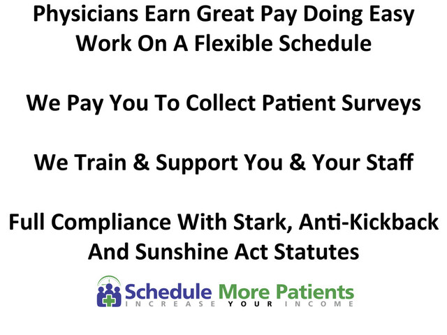 Flexible Schedule We Pay You To Collect Pa@ent Surveys We Train & Support You & Your Staff Full Compliance With Stark, An@-‐Kickback And Sunshine Act Statutes