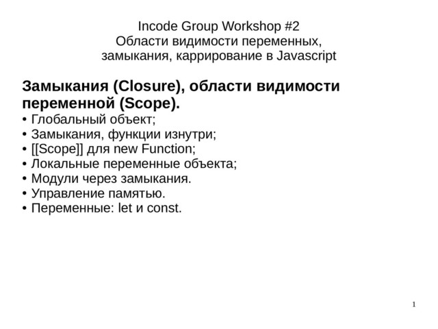 (Scope). Замыкания,функции изнутри • Лексическое окружение • Доступ к внешним переменным • Всегда текущее значение • Вложенные функции • Свойства функции Все переменные внутри функции – это свойства специального внутреннего объекта LexicalEnvironment, который создаётся при её запуске. При запуске функция создает объект LexicalEnvironment, записывает туда аргументы, функции и переменные. Процесс инициализации выполняется в том же порядке, что и для глобального объекта, который, вообще говоря, является частным случаем лексического окружения. В отличие от window, объект LexicalEnvironment является внутренним, он скрыт от прямого доступа. function sayHi(name) { // LexicalEnvironment = { name: 'Вася', phrase: undefined } var phrase = "Привет, " + name; // LexicalEnvironment = { name: 'Вася', phrase: 'Привет, Вася'} alert( phrase ); } sayHi('Вася');